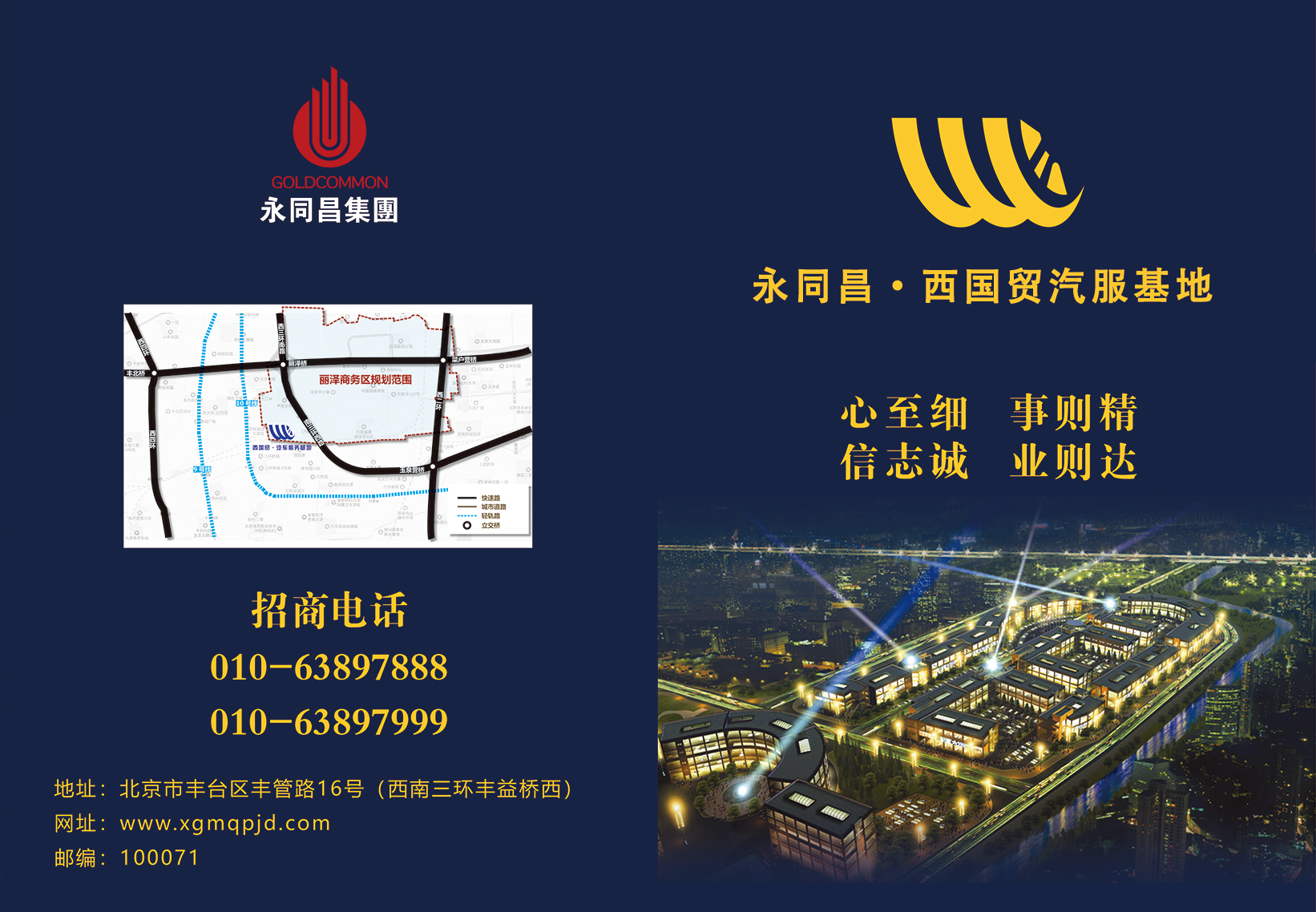 北京永同昌·西國貿汽服基地是永同昌集團的重點產業之一,屬于北京市豐臺區麗澤商務區核心項目。目前入駐商戶逾千家。業務范圍包括整車銷售、汽車改裝、汽車維修、汽車輪胎、汽車配件、汽車電子、裝飾用品等多個領域,品種、品牌、車系、規格齊全,基本涵蓋了中國公路上行駛的所有車型。基地擁有八部貨梯、二十部自動扶梯可以無障礙輕松運送貨物至二、三層,能夠為廣大采購商、消費者提供全面完善的售前、售中、售后服務。